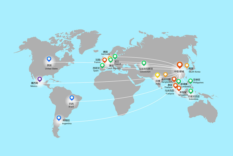 Mexico, Brazil, Morocco, Poland, Czech Republic, France, Spain, Thailand, South Korea, India, Bangladesh, Uzbekistan, Philippines, Malaysia, Indonesia, Iran, Cambodia